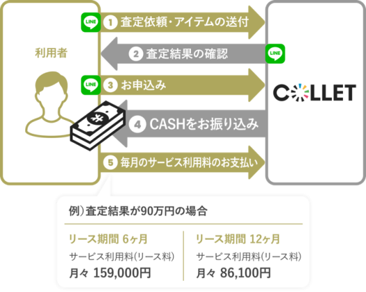質屋とは異なり、リースバックを活用したサービスです。COLLET CASHのリースバックとは、お客様のアイテムの買取をさせていただき(買取代金をお支払いし)、月額サービス料(リース料)のお支払いを通じて、アイテムの買戻しをしていただくサービスです。